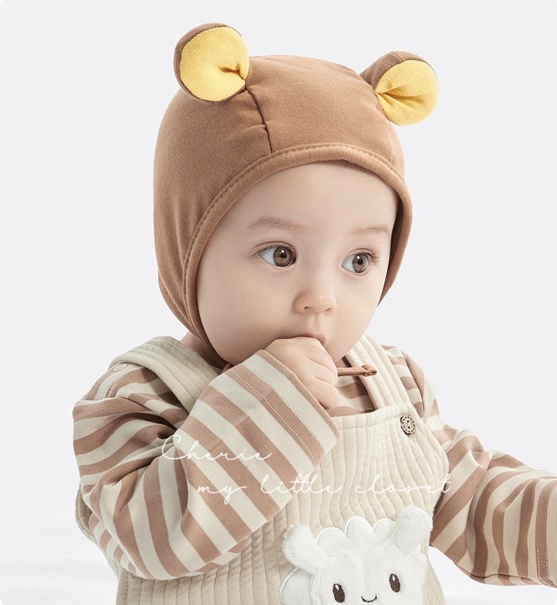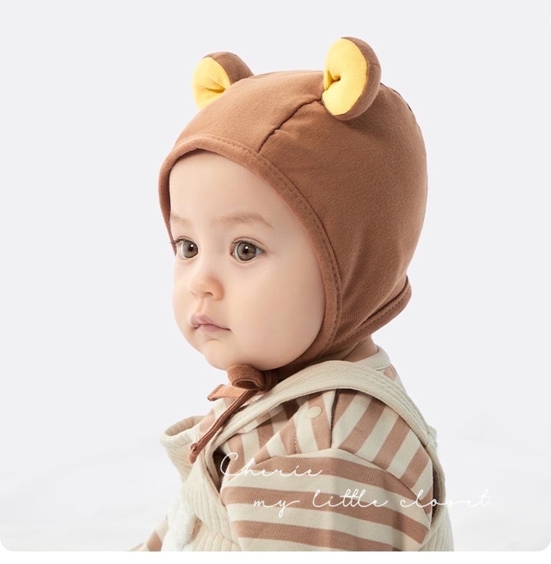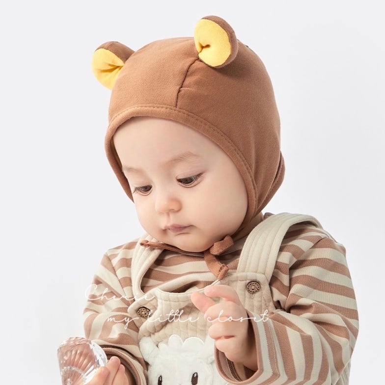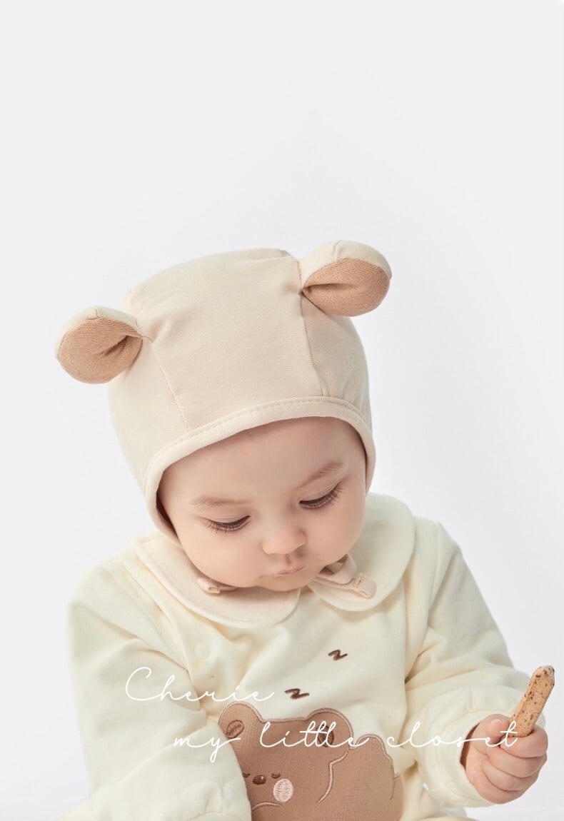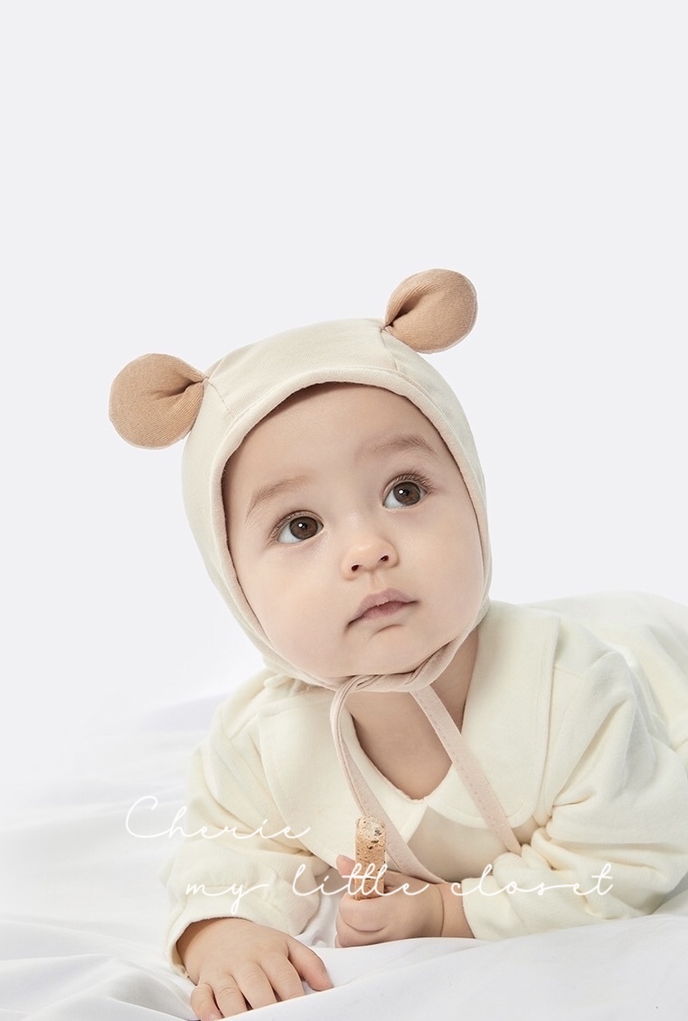 クマさんのような耳が可愛いベビーボンネット。